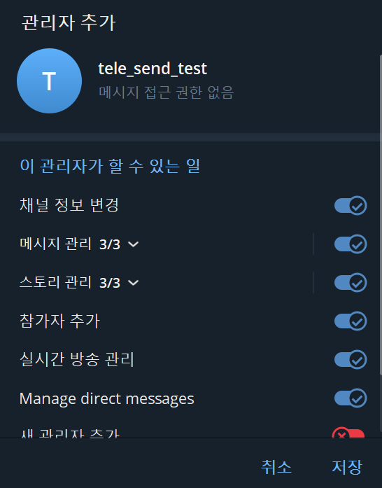7. 이전에 생성한 봇을 관리자로 추가합니다.