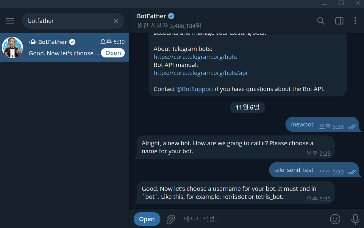 마지막은 bot이 들어가야 합니다. 예) tele_send_test_bot