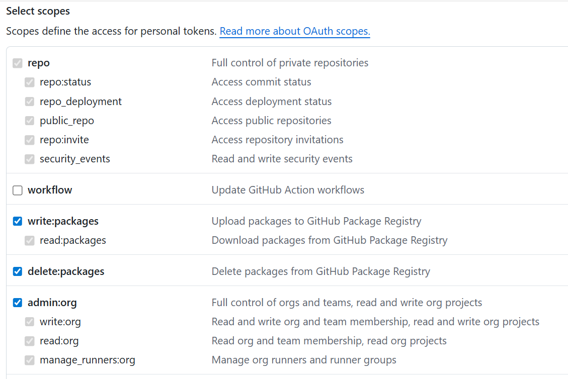 repo , write:packages , delete:packages , admin:org , gist , admin:gpg_key